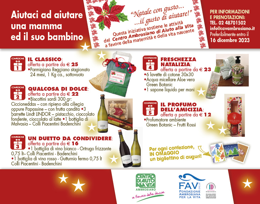 A Natale, scegli di fare un dono fra quelli proposti dal CAV Ambrosiano: oltre a fare un regalo di qualità ai tuoi cari e ai tuoi amici, donerai un futuro ad una mamma e al suo bambino in situazione di difficoltà... E ogni nascita, è Natale!