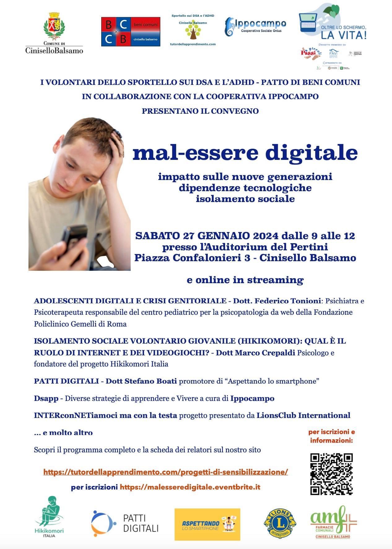 l progetto OLTRE LO SCHERMO, LA VITA! partecipa al convegno MAL-ESSERE DIGITALE che si terrà nella mattinata del 27 gennaio a Cinisello Balsamo (organizzato dallo Sportello DSA - ADHD del Comune di Cinisello B. e dalla Cooperativa Ippocampo). Per iscriversi, collegarsi al seguente link: https://www.eventbrite.it/e/